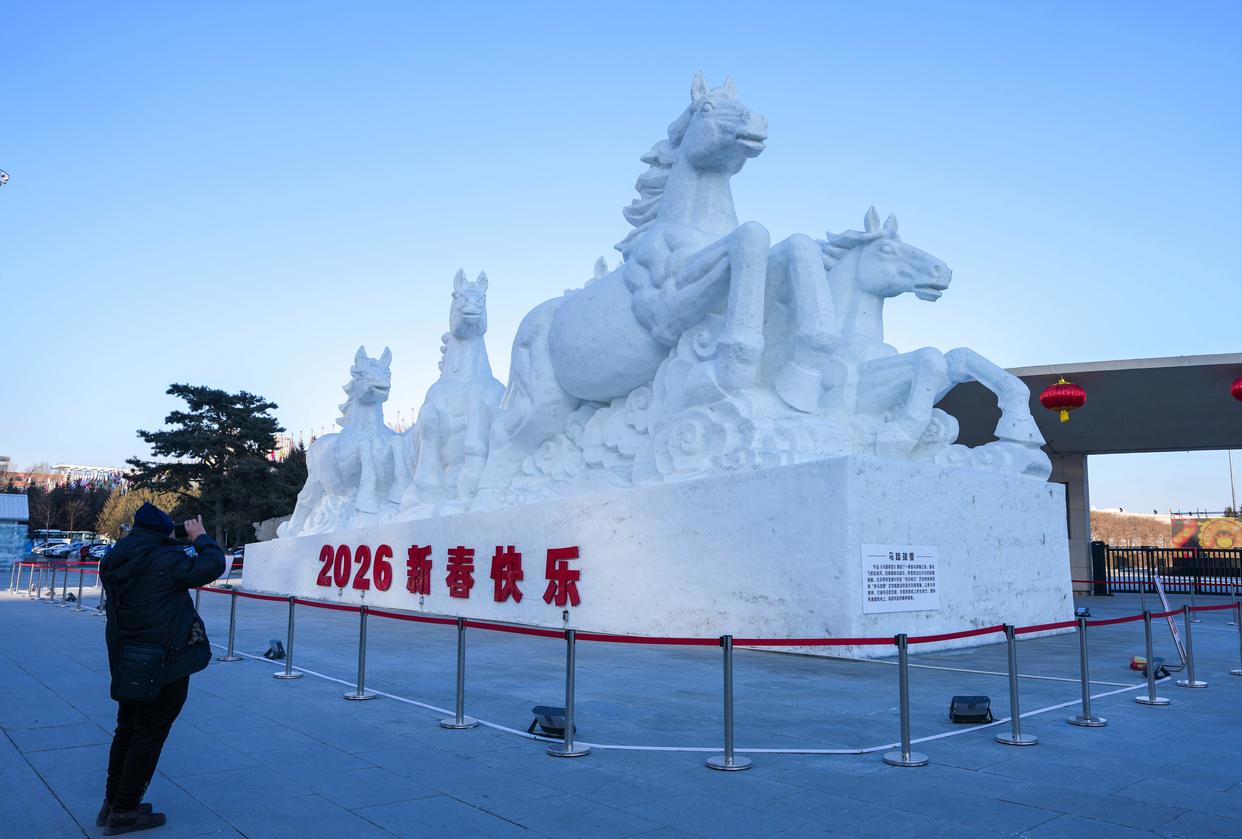 1月5日,游客在长春世界雕塑园观赏“马年”主题雪雕。新华社记者 颜麟蕴 摄