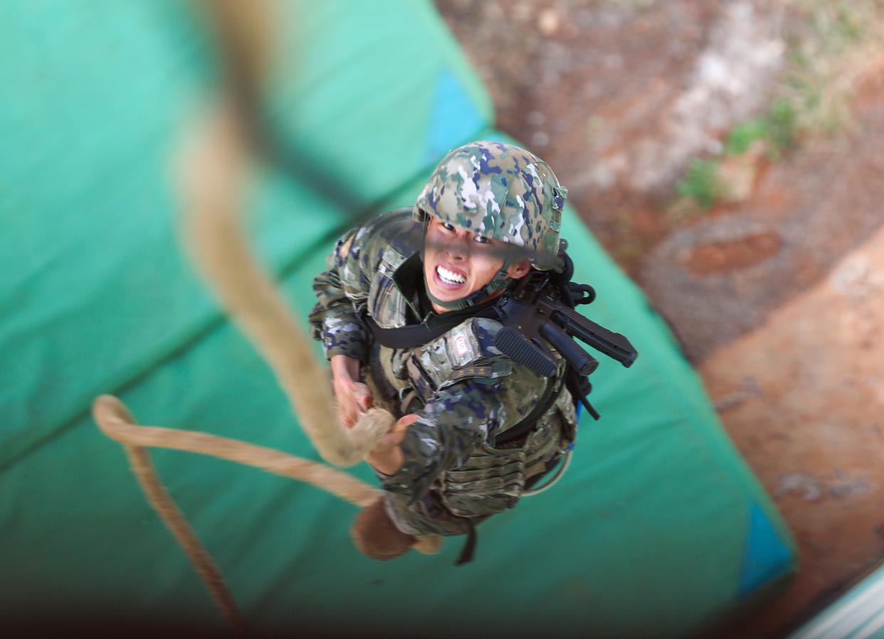 1月4日,武警海南总队展开实战化训练,一名战士在奋力攀爬18米大绳。新华社发(王翔宇 摄)
