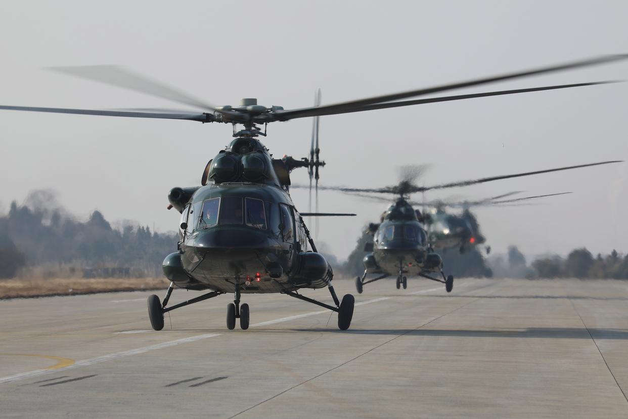1月6日,武警第二机动总队某支队直升机编队起飞。新华社发(兰志豪 摄)