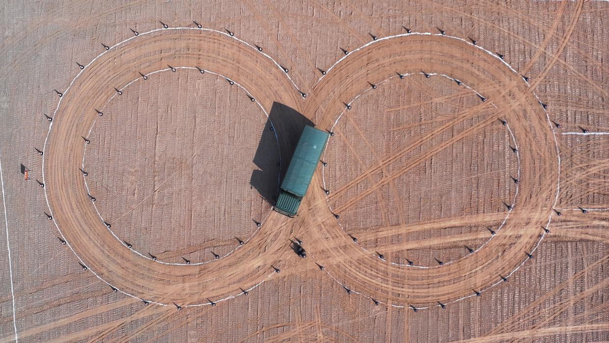 1月4日,武警广西总队梧州支队开赴野外训练场,组织官兵进行汽车综合驾驶训练(无人机照片)。新华社发(柯江涛 摄)