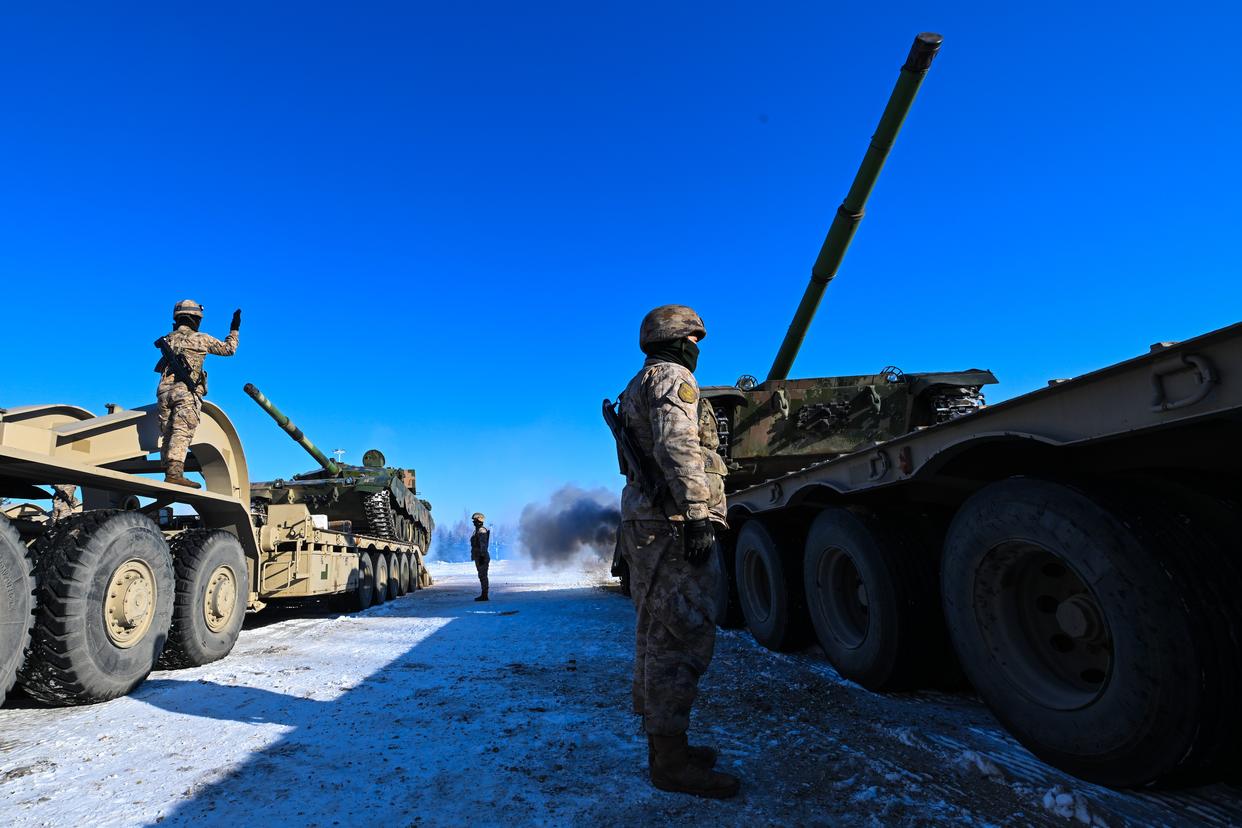 1月4日,联勤保障部队某汽车运输旅和陆军某部联合开展重装运输车装载训练。新华社发(胥永政 摄)