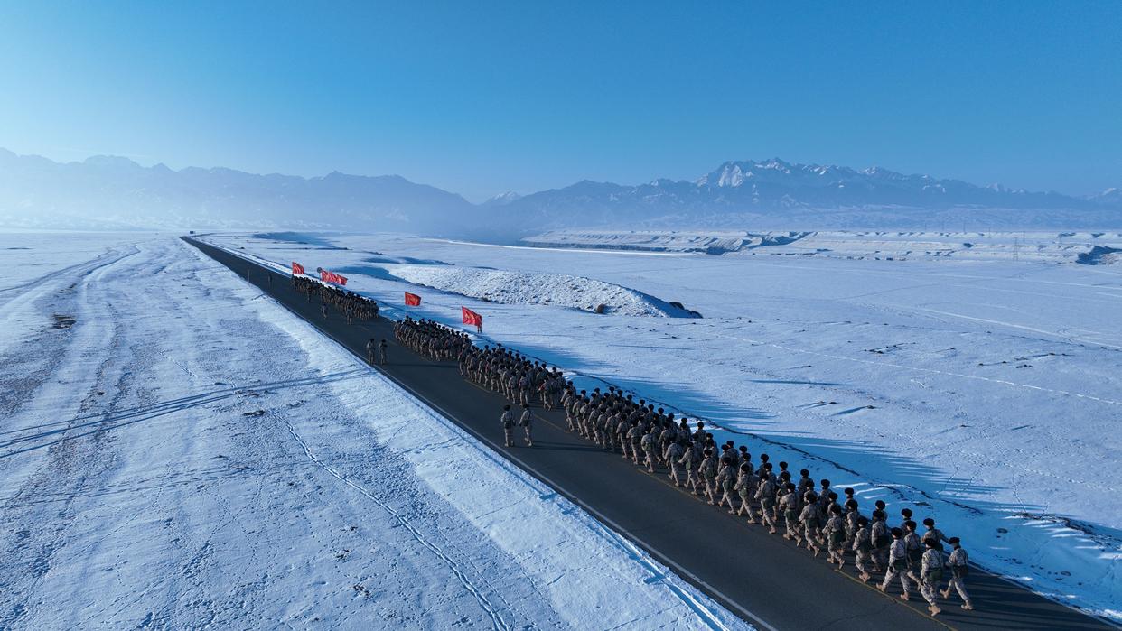 1月4日,武警兵团总队某部官兵在天山脚下组织徒步行军(无人机照片)。新华社发(周昌钰 摄)
