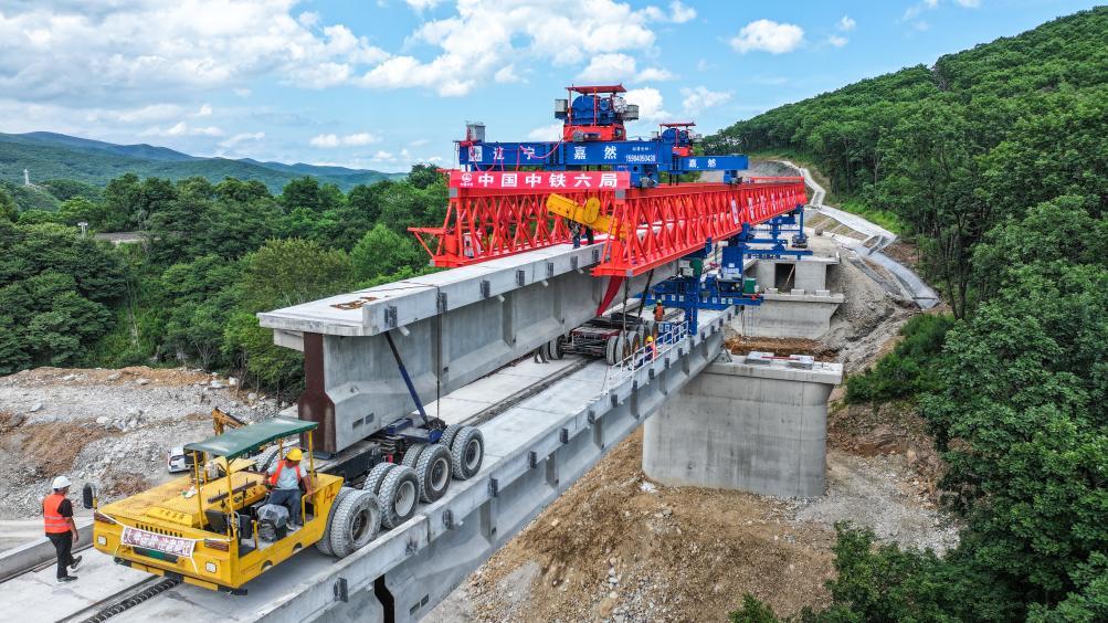 运梁机在运送梁片(2025年7月20日摄,无人机照片)。