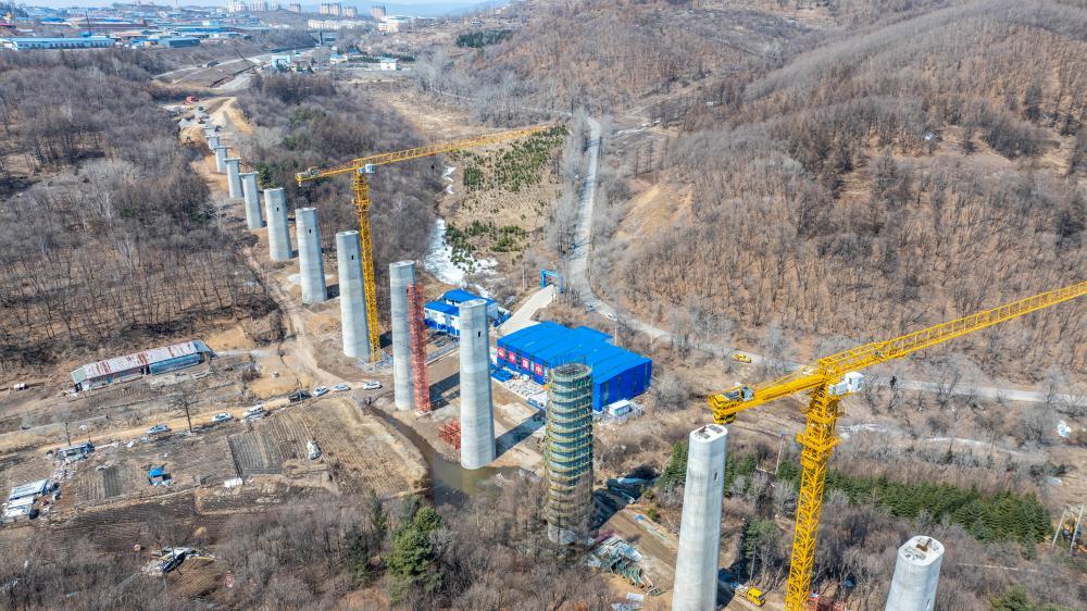建设中的滨绥铁路提质改造工程1号桥桥墩(2025年4月10日摄,无人机照片)。