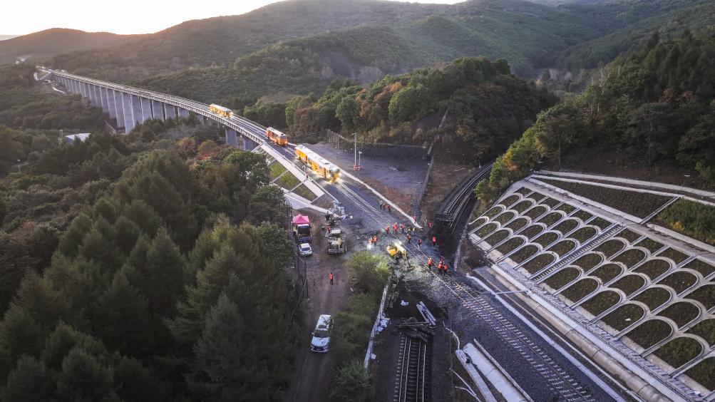 施工人员对新线道砟进行填充作业(2025年9月26日摄,无人机照片)。