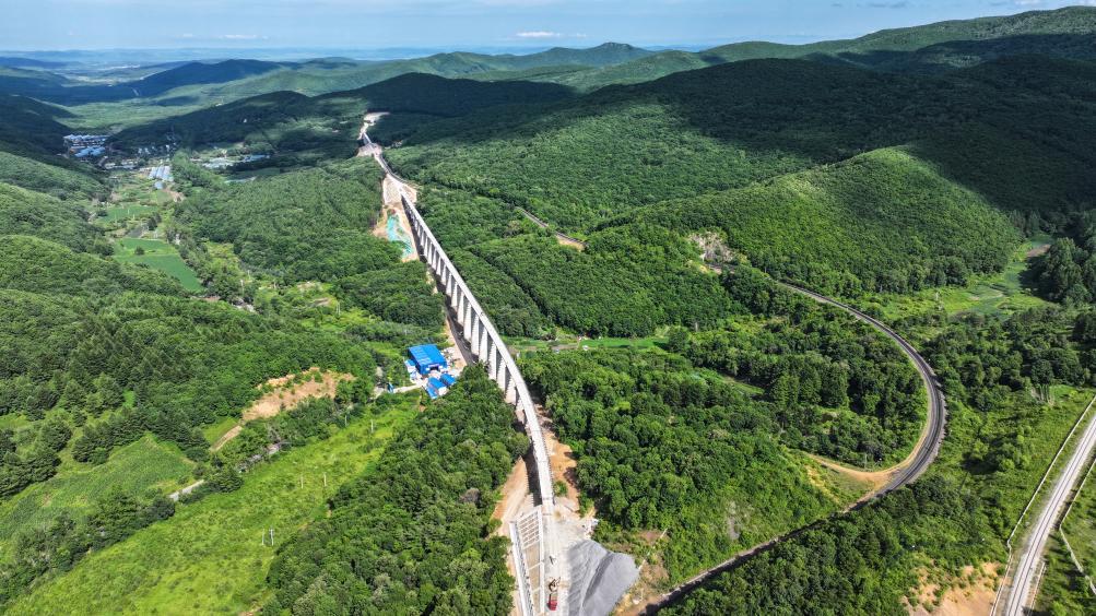 架设完成的滨绥铁路提质改造工程1号桥全貌(2025年7月20日摄,无人机照片)。