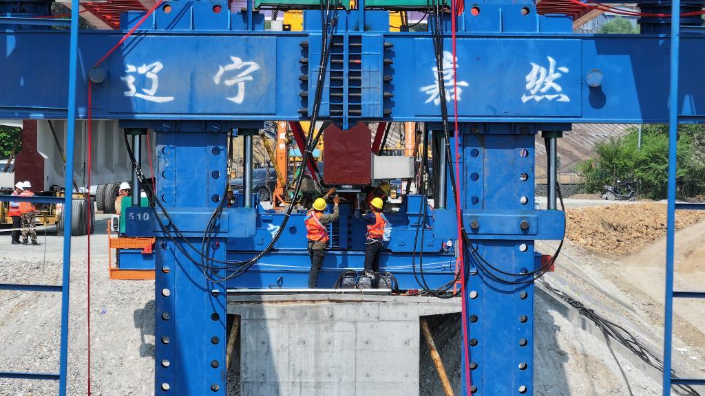 施工人员在架梁时上固定螺杆(2025年5月31日摄,无人机照片)。