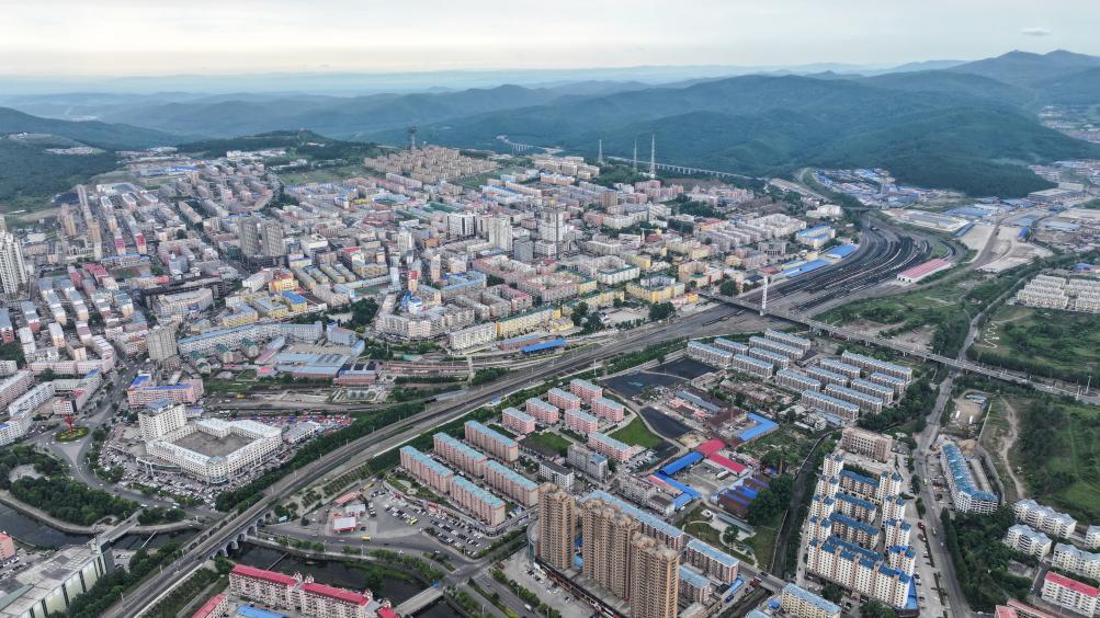 百年口岸黑龙江省绥芬河市,滨绥铁路穿城而过(2025年7月13日摄,无人机照片)。