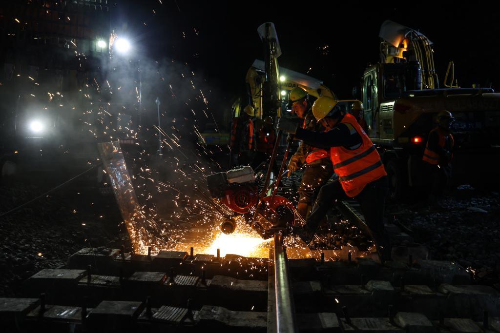 施工人员对国境线最后一公里新钢轨进行连接(2025年9月26日摄)。