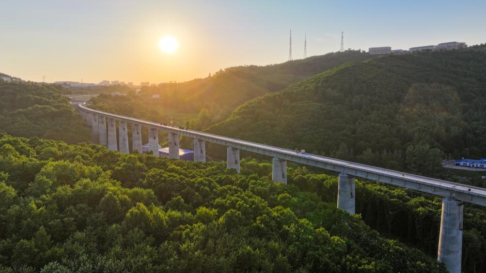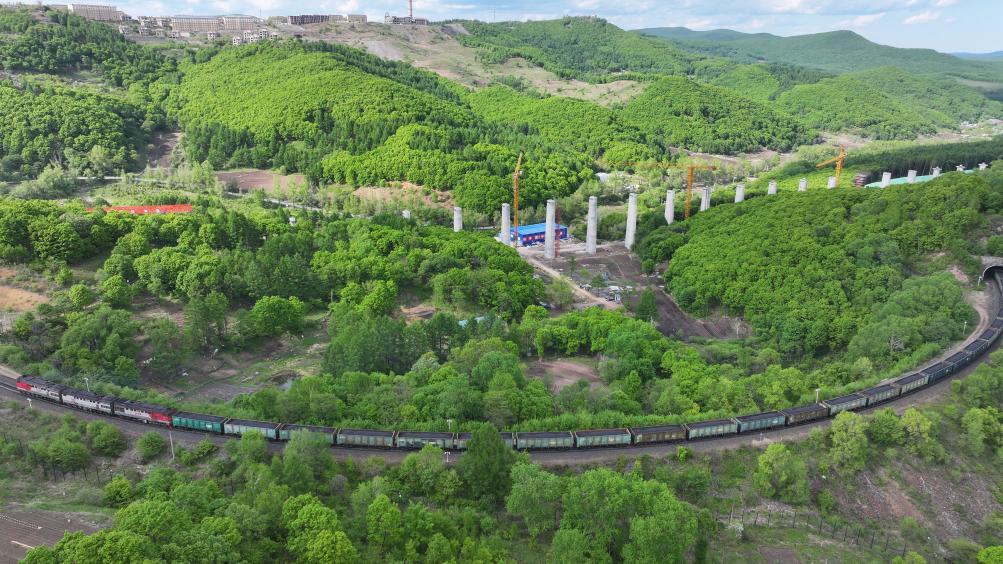 行驶在百年老线路上的一列进口货物列车驶入绥芬河铁路口岸,与远处新建滨绥铁路提质改造工程1号桥遥相呼应(2025年5月26日摄,无人机照片)。
