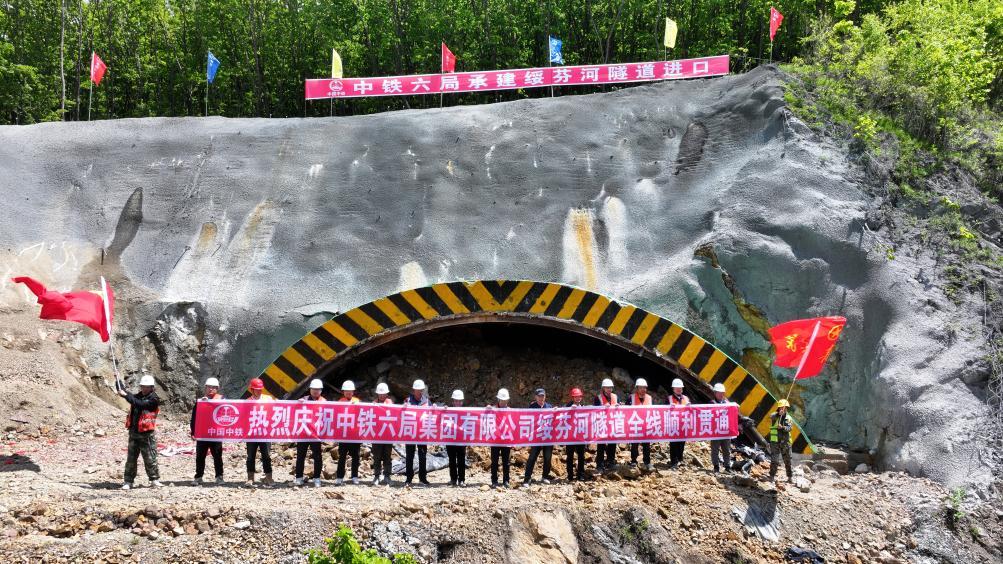 施工人员庆祝隧道全线贯通(2025年5月26日摄,无人机照片)。