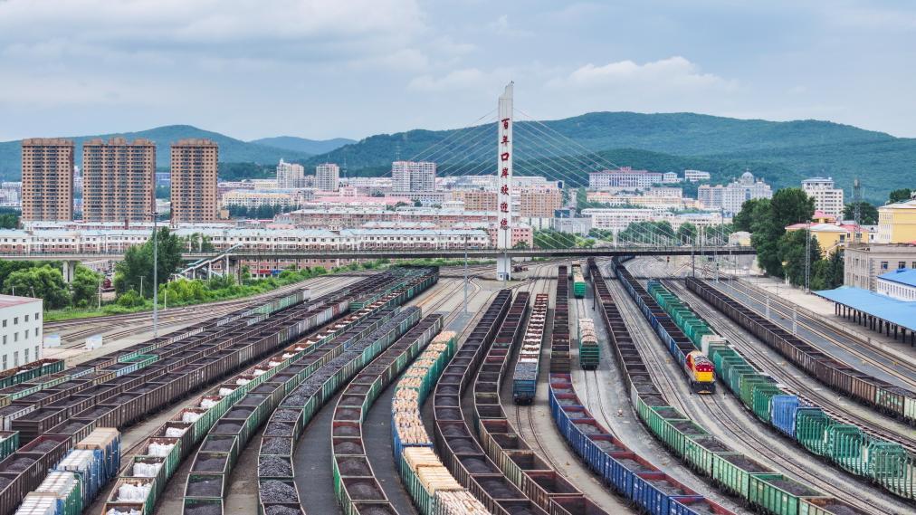 绥芬河铁路口岸南场,一列列满载货物的入境列车等待解体换装(2025年7月13日摄,无人机照片)。