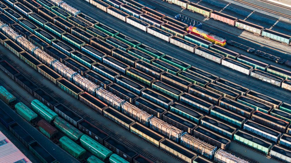 绥芬河铁路口岸南场,满载着进口货物的列车等待解体换装(2025年10月18日摄,无人机照片)。