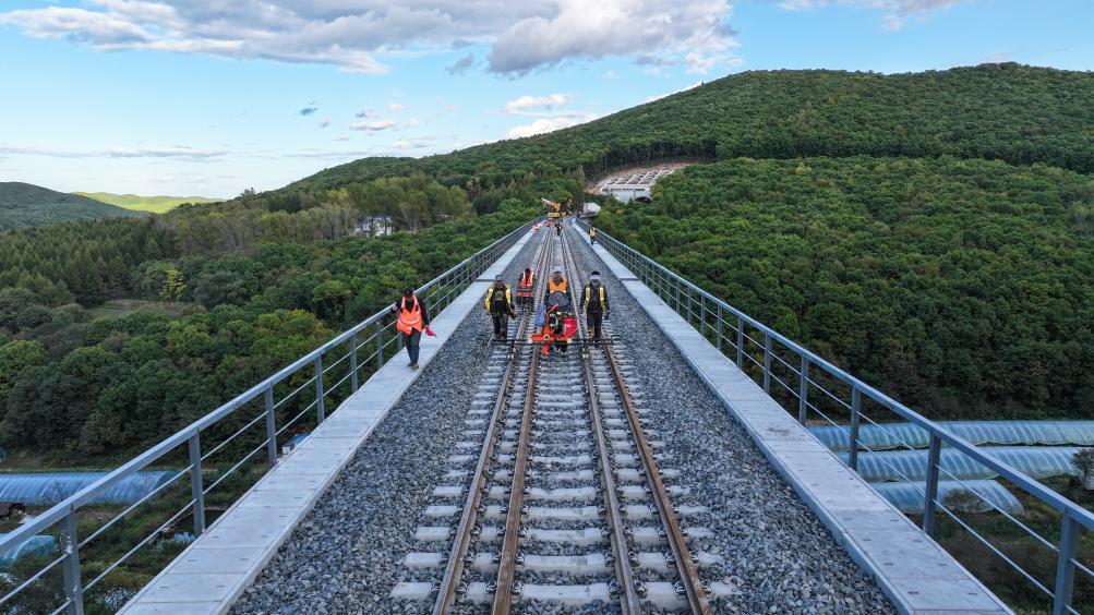 工作人员对新线钢轨进行轨距测量作业(2025年9月26日摄,无人机照片)。