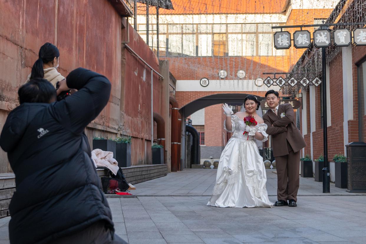 1月7日,一对新人在湖北省荆州市沙市洋码头文创园拍摄婚纱照。新华社记者 杜子璇 摄