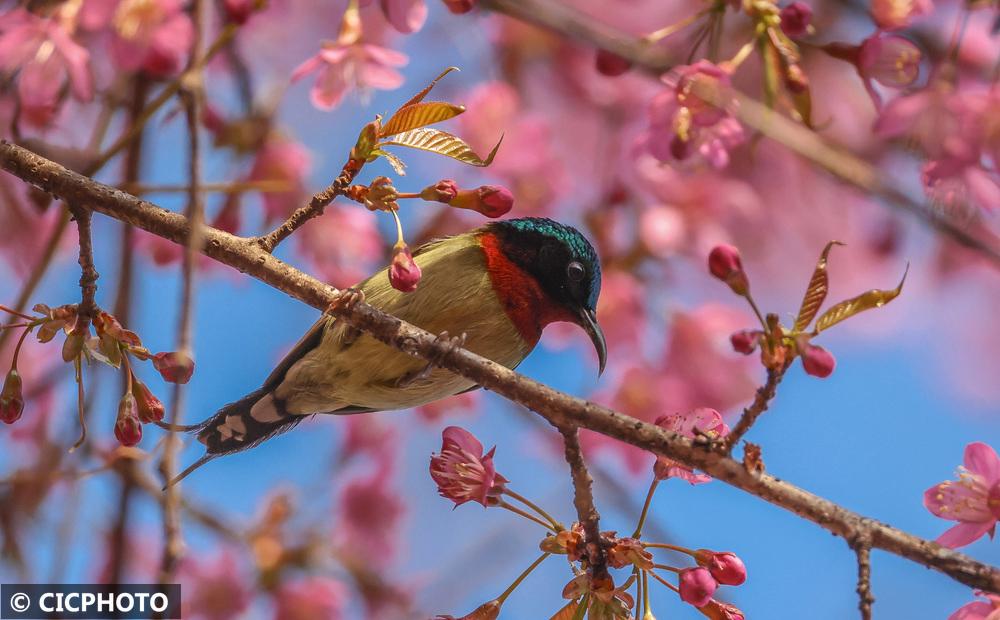 ↑2026年1月8日,一只叉尾太阳鸟在重庆市巫山县职业教育中心校园内的冬樱花枝头停歇。CICPHOTO/冯光伦 摄