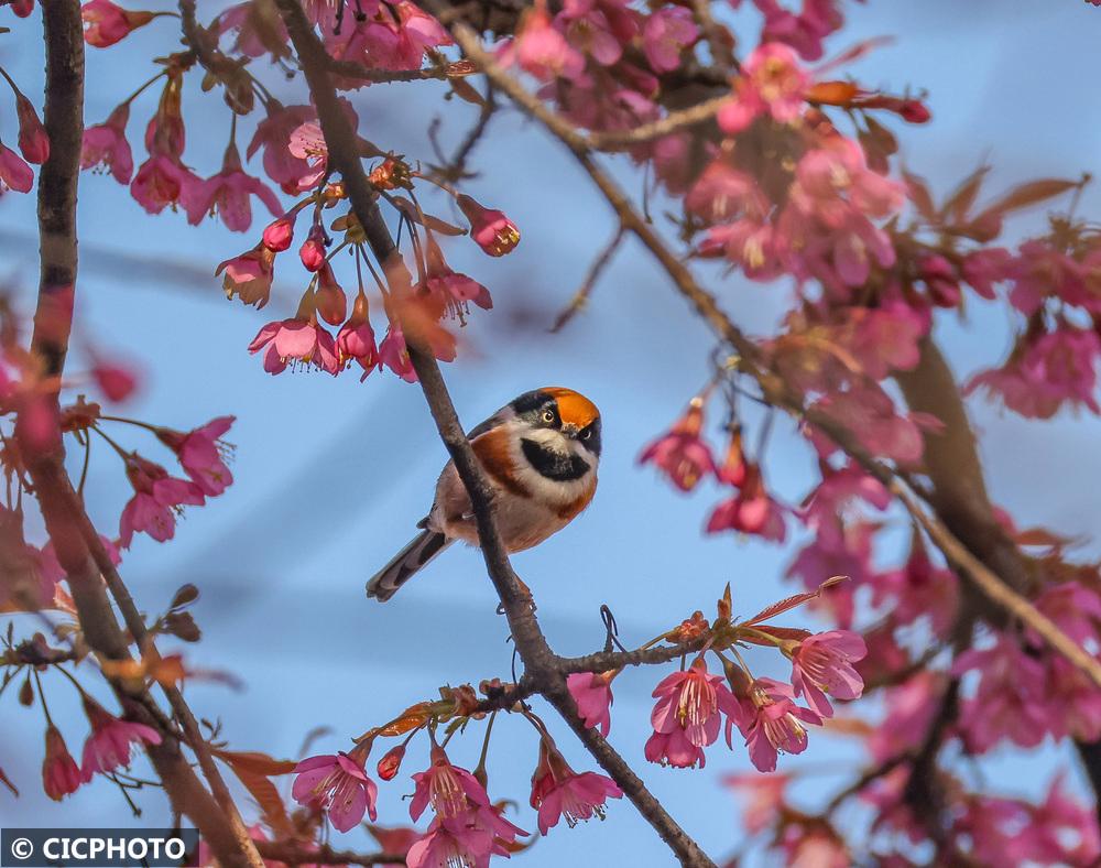 ↑2026年1月8日,一只红头长尾山雀在重庆市巫山县职业教育中心校园内的冬樱花枝头停歇。CICPHOTO/冯光伦 摄