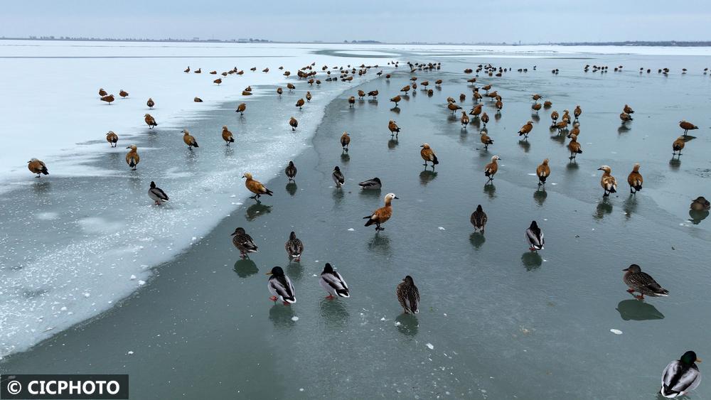 ↑2025年12月21日,赤麻鸭和绿头鸭在甘肃省酒泉市金塔县解放村水库栖息。(无人机照片)CICPHOTO/曹红祖 摄