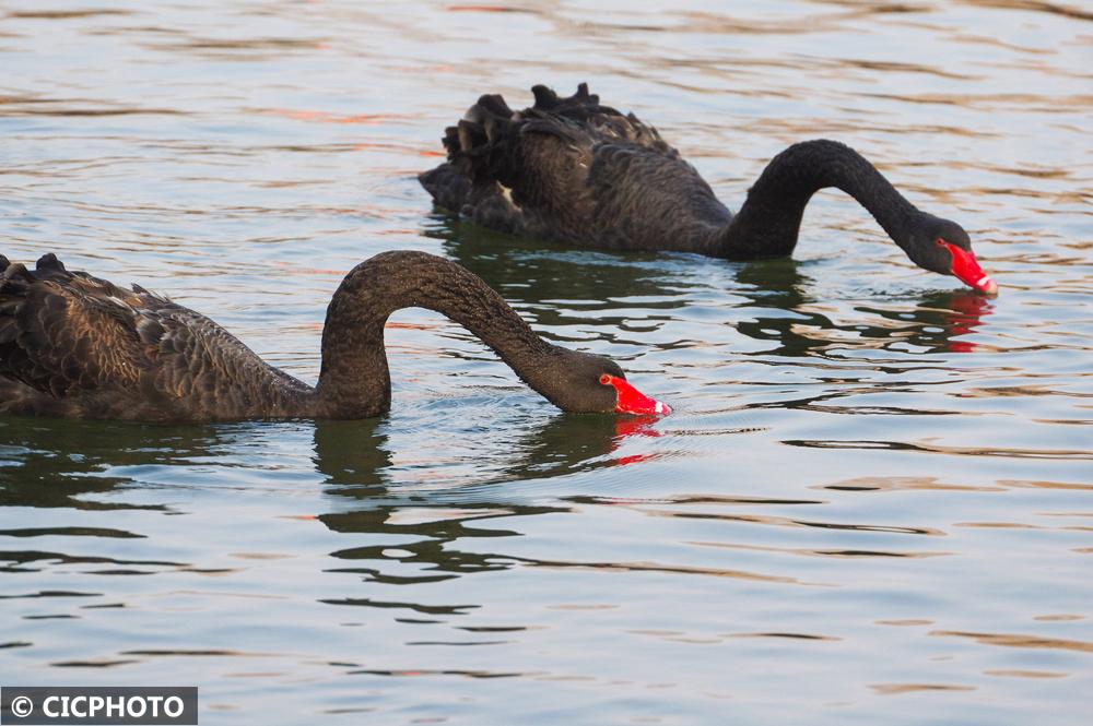 ↑2026年1月5日在河北省邯郸市鸡泽县诗经文化园天鹅湖拍摄的黑天鹅。CICPHOTO/金书怀 摄