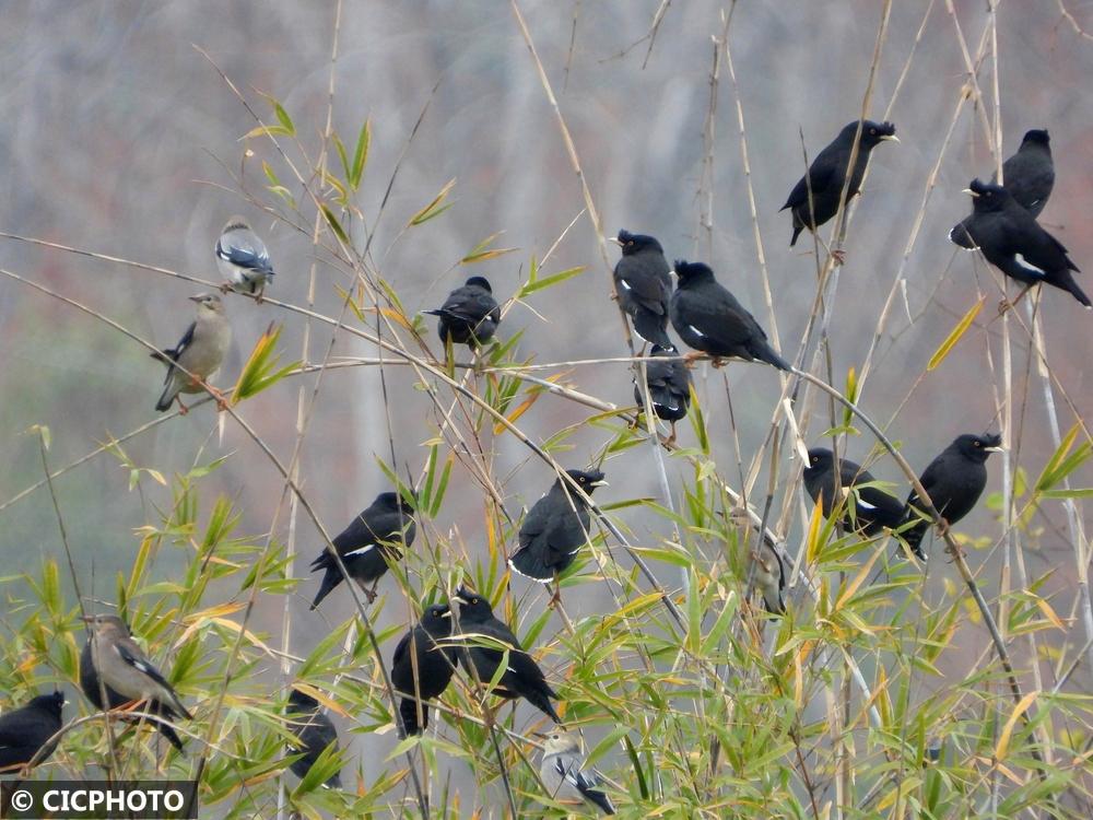 ↑2025年12月22日,丝光椋鸟和八哥在江西省抚州市金溪县陈坊积乡城湖村河畔林间栖息。CICPHOTO/邓兴东 摄