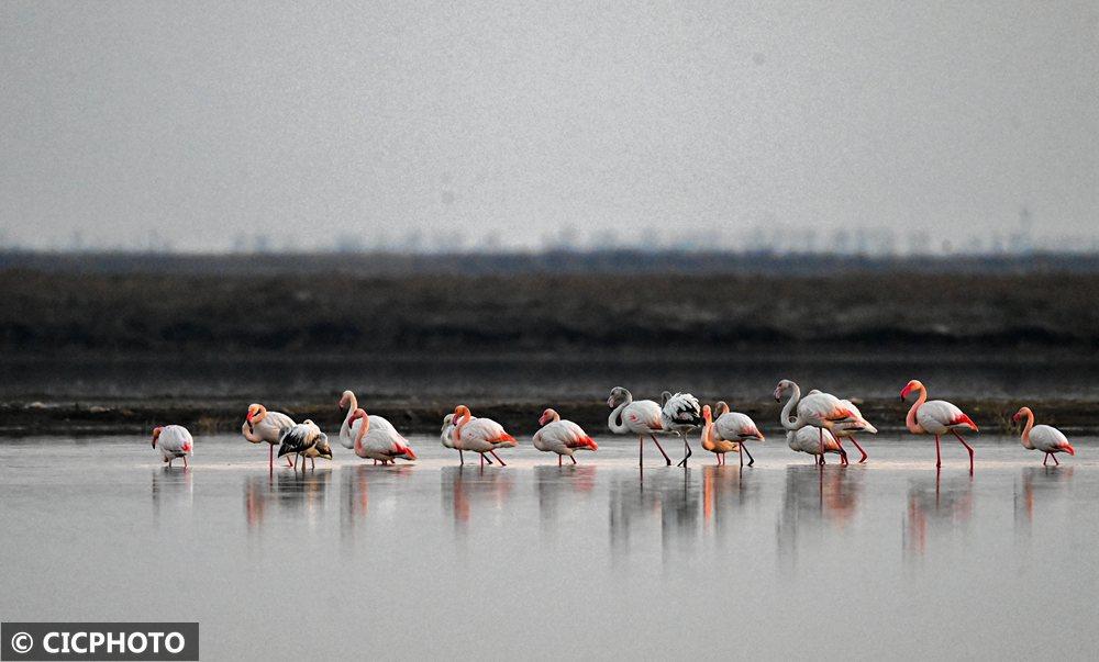 ↑2026年1月3日,火烈鸟在江苏东台条子泥湿地栖息。CICPHOTO/孙家录 摄
