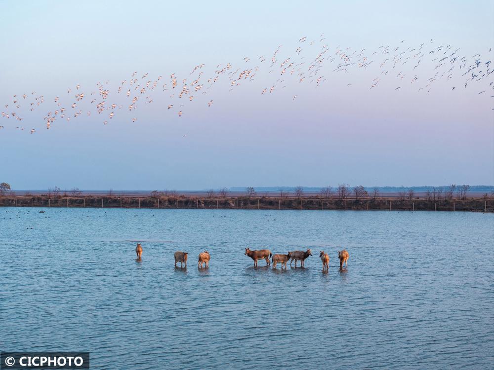 ↑2025年12月6日在江苏省盐城市大丰区黄海野鹿荡拍摄的麋鹿和候鸟。CICPHOTO/胡志超 摄