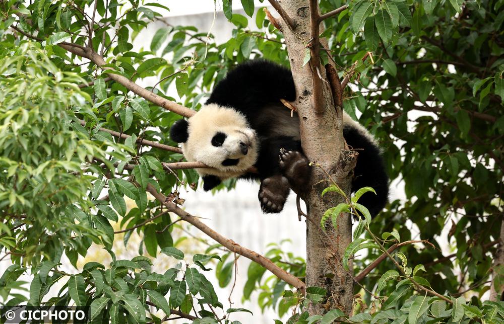 ↑2025年12月13日,一只大熊猫在成都大熊猫繁育研究基地的树上睡觉。CICPHOTO/姚永亮 摄
