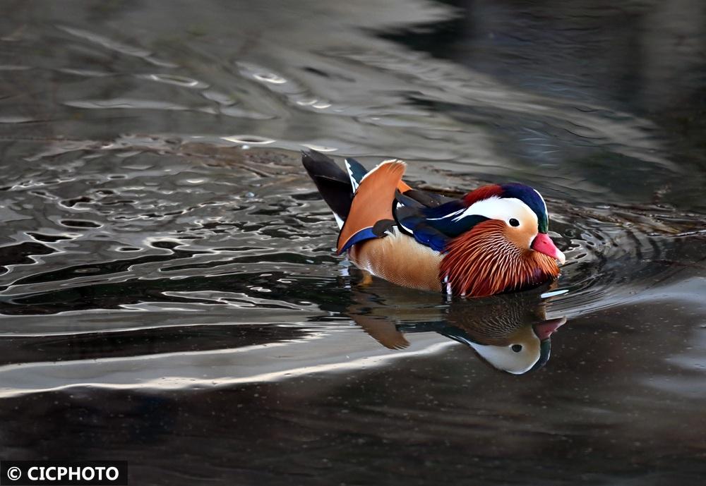 ↑2025年12月9日,一只鸳鸯在辽宁省沈阳市南运河水域栖息。CICPHOTO/赵敬东 摄