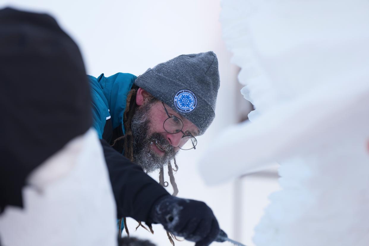 1月9日,中国一队参赛选手在进行雪雕作品《噬》收尾工作,作品最终获三等奖。新华社记者 王松 摄