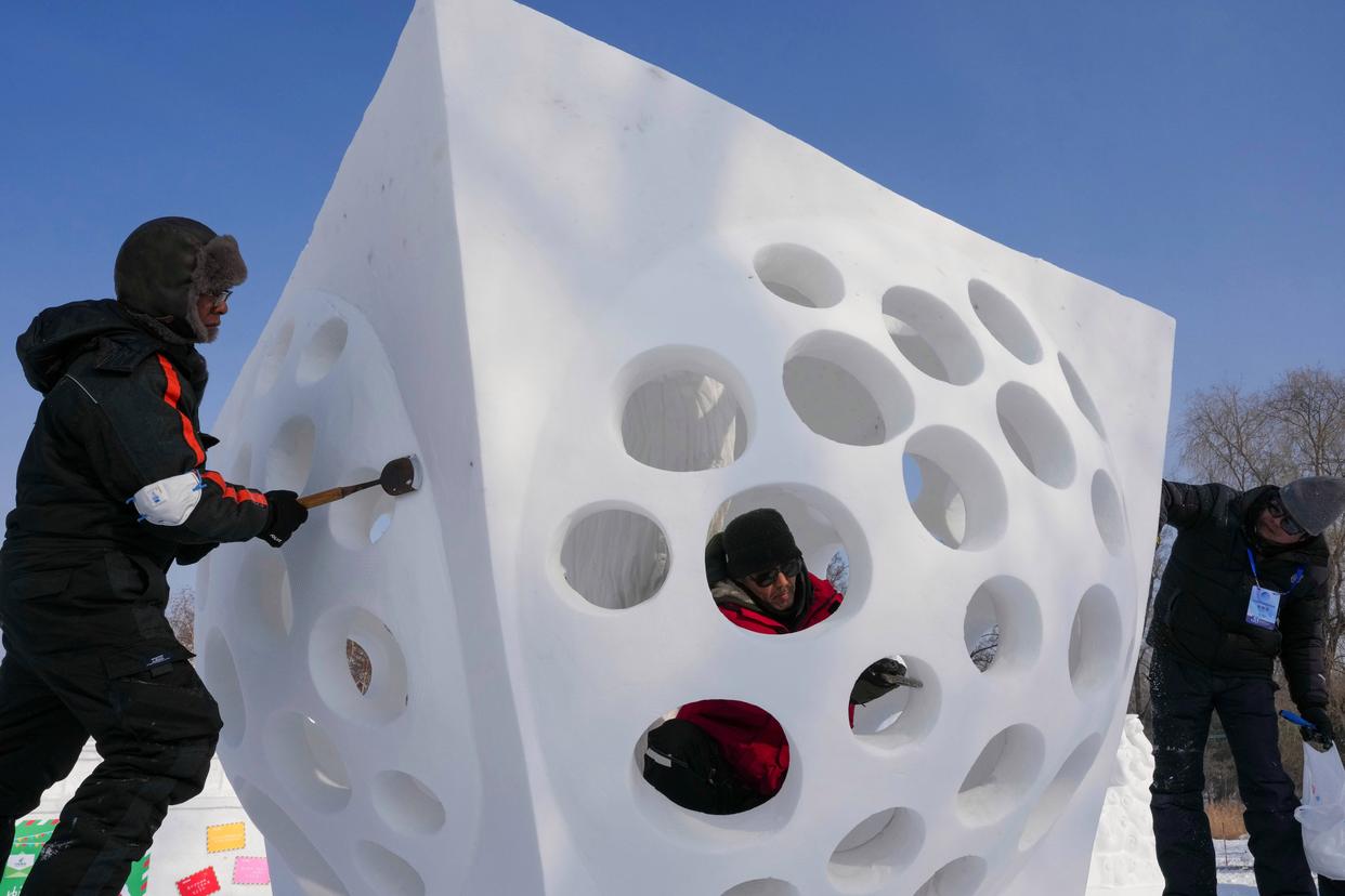 1月9日,韩国队参赛选手在进行雪雕作品《扩展+空间》收尾工作,作品最终获二等奖。新华社记者 王建威 摄