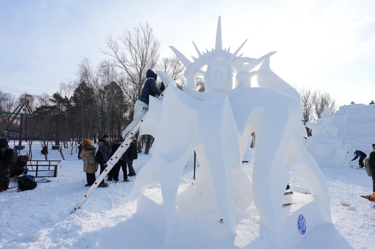 1月9日,俄罗斯阿穆尔斯克队参赛选手在进行雪雕作品《自由的幻象》收尾工作,作品最终获得最佳技巧奖。新华社记者 王建威 摄