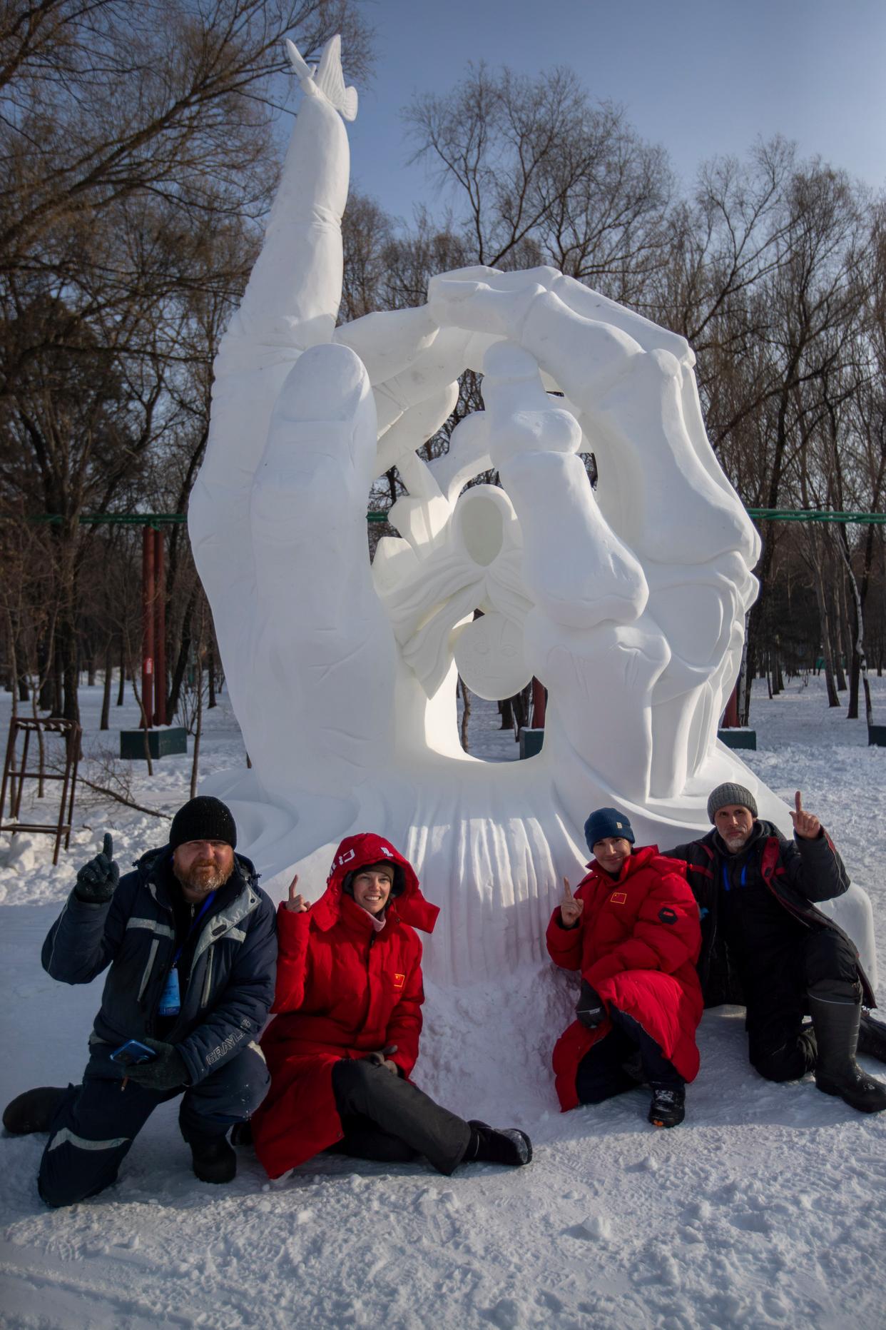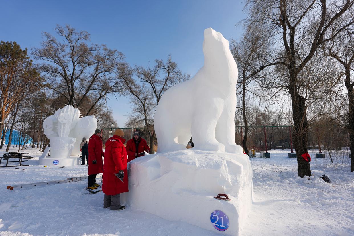 1月9日,中国四队参赛选手在进行雪雕作品《听说你的家乡很美》收尾工作,作品最终获二等奖。新华社记者 王建威 摄