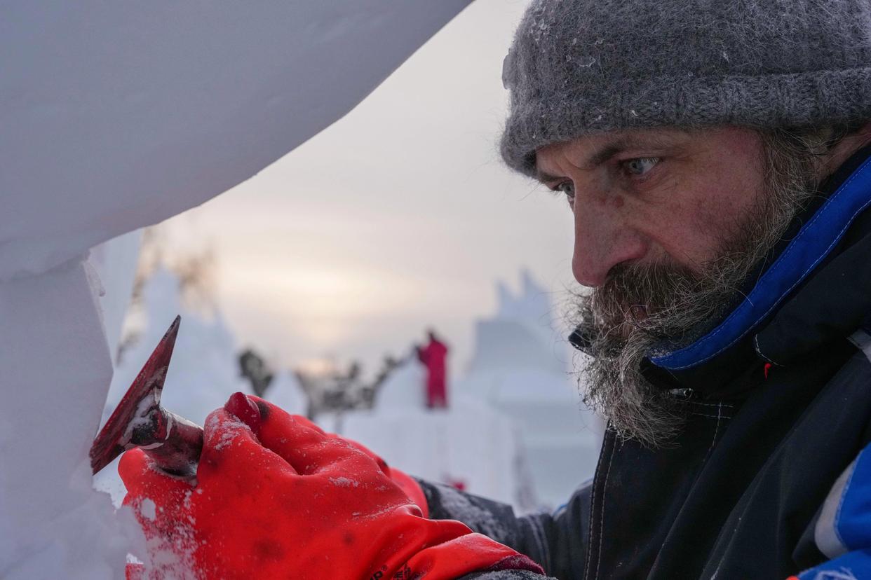 1月8日,俄罗斯哈巴罗夫斯克二队参赛选手在进行雪雕作品《单恋》的创作,作品最终获一等奖。新华社记者 王建威 摄