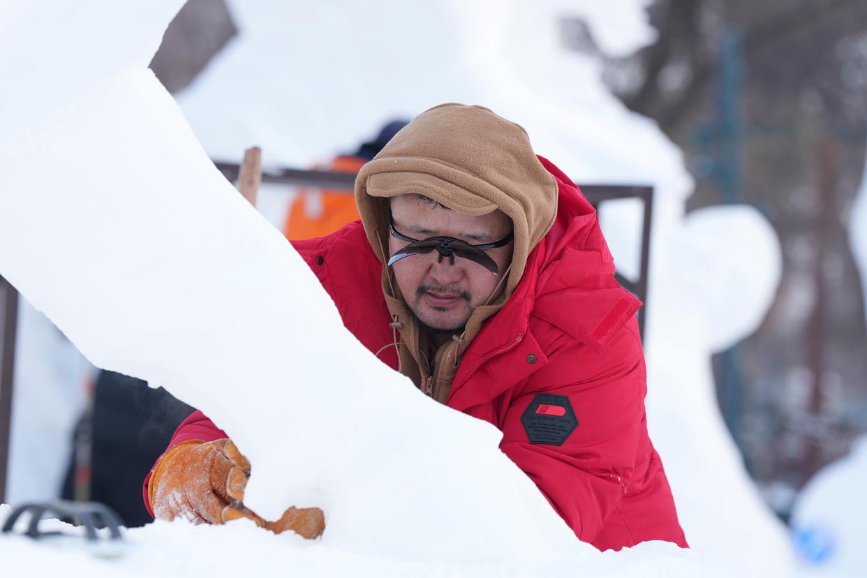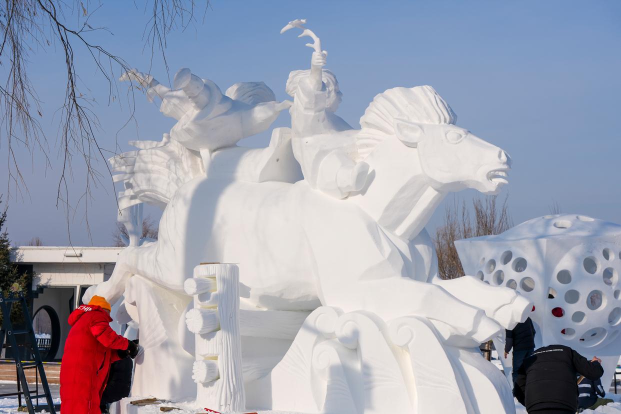 1月9日,参赛选手在进行雪雕作品《驯牛者》收尾工作,作品最终获三等奖。新华社记者 王建威 摄
