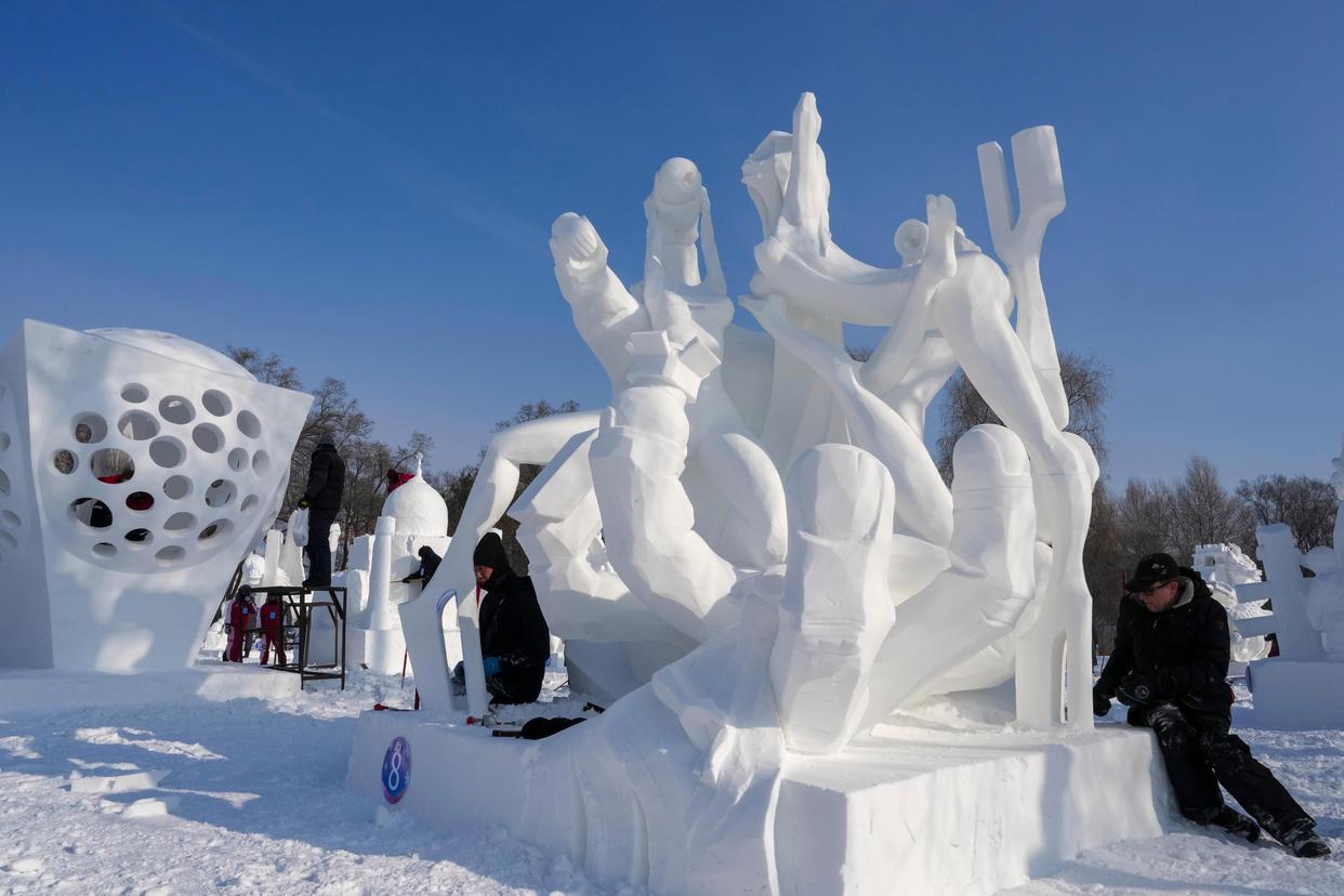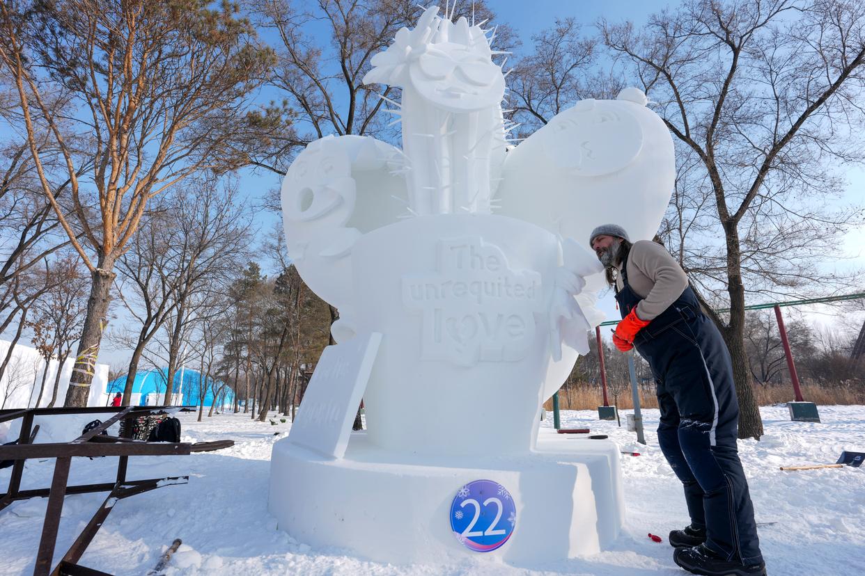 1月9日,俄罗斯哈巴罗夫斯克二队参赛选手在进行雪雕作品《单恋》收尾工作,作品最终获一等奖。新华社记者 王松 摄