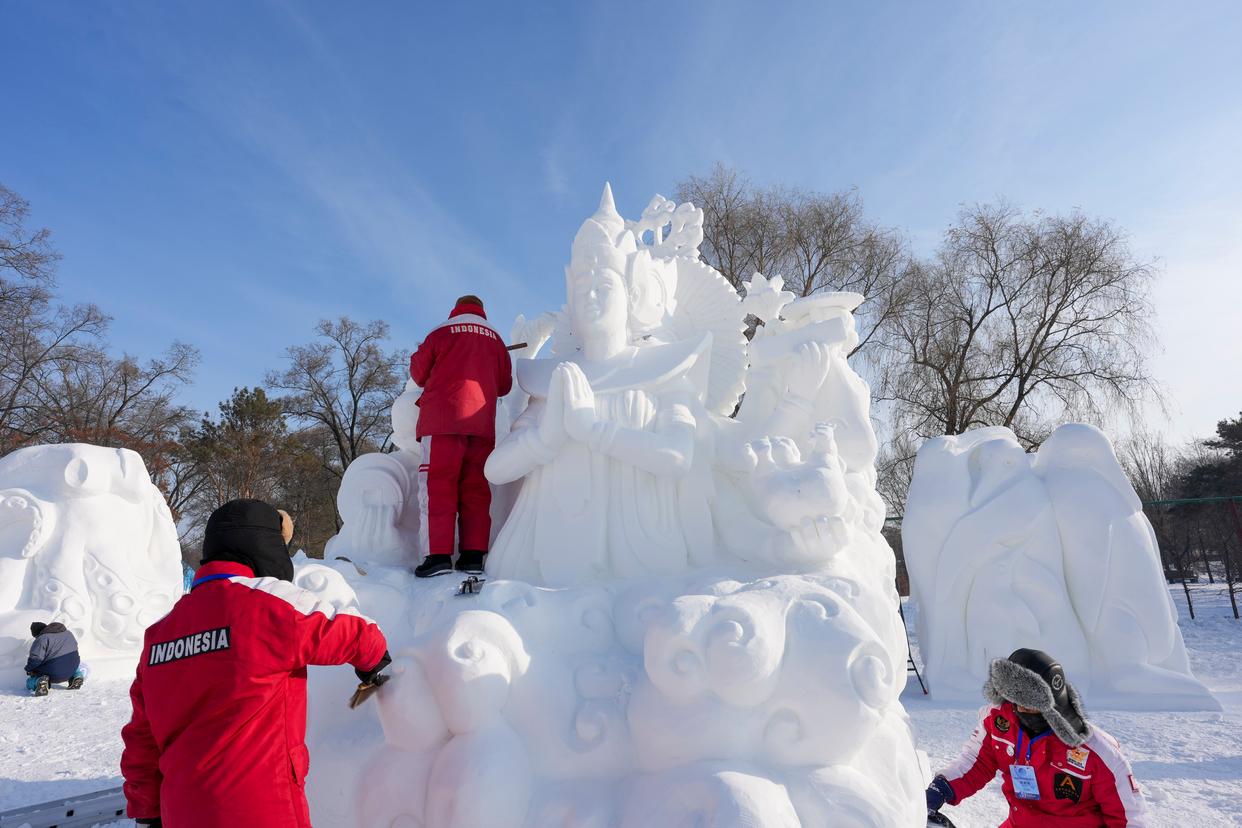 1月9日,印度尼西亚队参赛选手在进行雪雕作品《德维·达万塔里》收尾工作,作品最终获三等奖。新华社记者 王松 摄