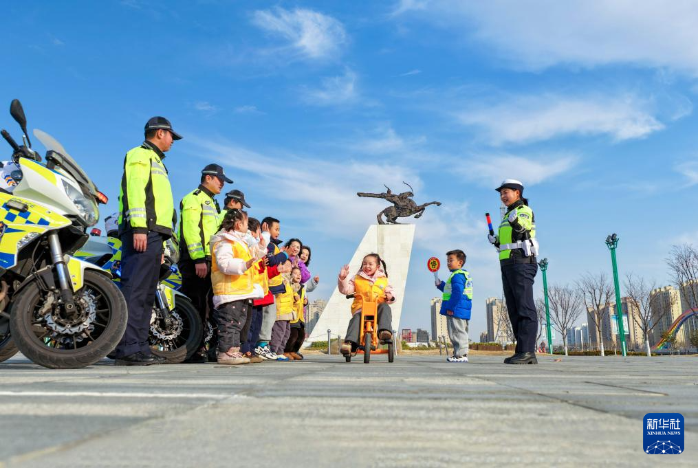 1月10日,在江苏省兴化市昭阳湖公园,兴化市公安局交警与兴化市昭阳湖幼儿园的小朋友们进行交通安全情景模拟游戏互动(无人机照片)。