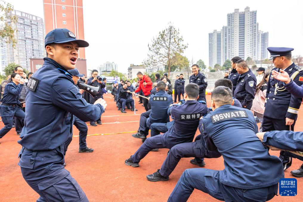 1月10日,警察在贵州省安顺市公安局参加拔河比赛。