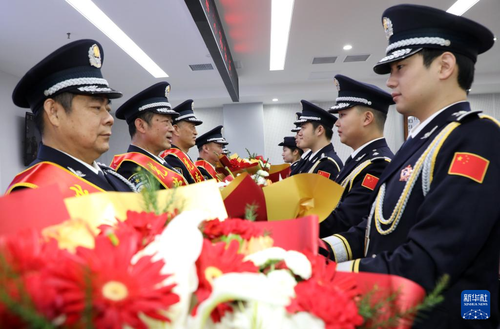 1月10日,在山东省滨州市博兴县公安局“退休民警荣退仪式”上,年轻民警向退休民警敬献鲜花。