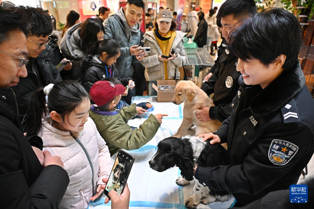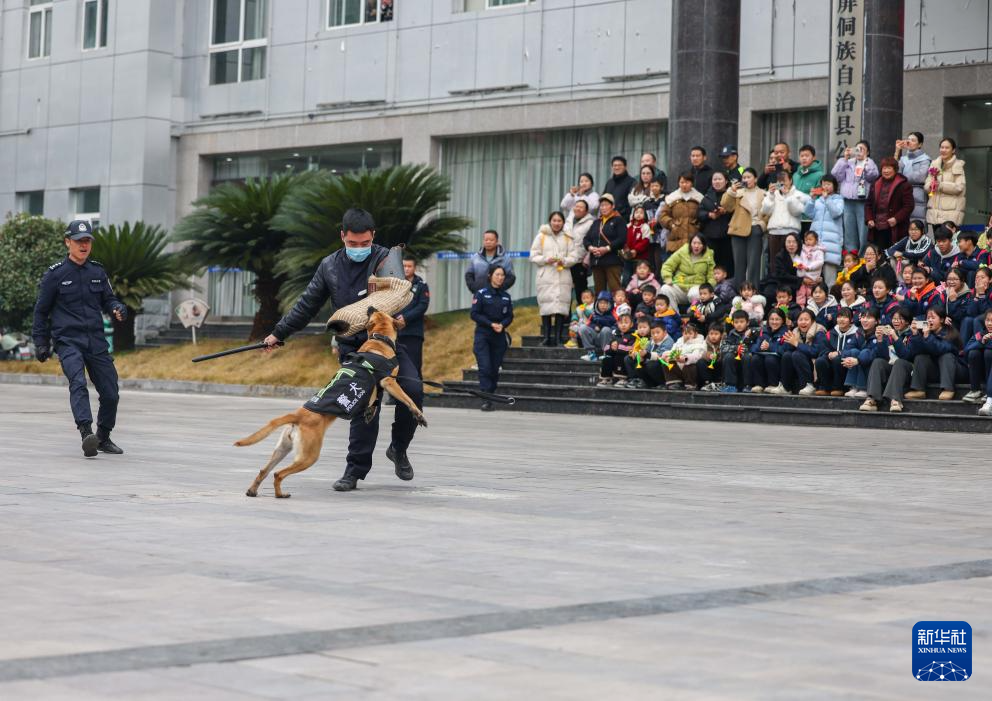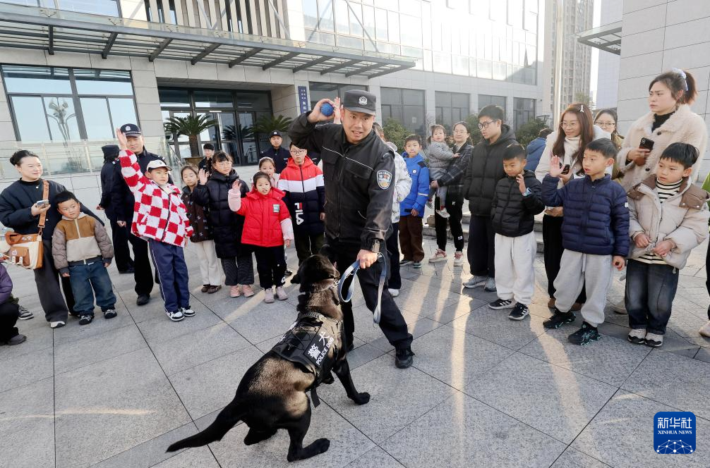 1月10日,在浙江省湖州市德清县公安局舞阳派出所举行的警营开放日活动中,市民观看警犬训练展示。