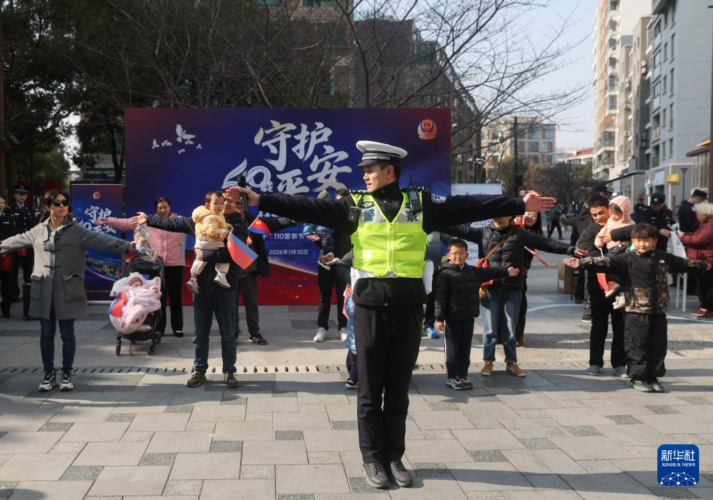 1月10日,上海市公安局杨浦分局民警在“平安杨浦开放麦”活动现场进行交通指挥手势教学。