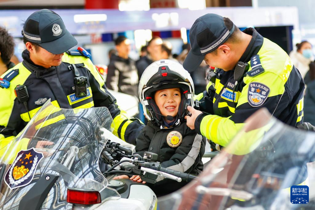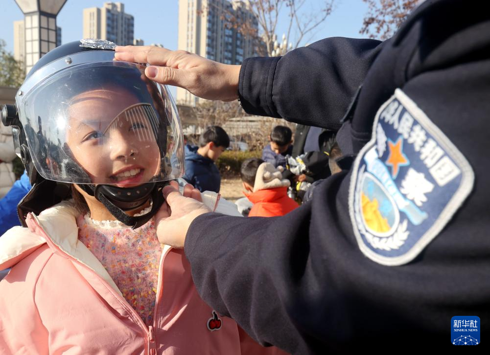 1月10日,在武汉市公安局警营开放日活动现场,小朋友在民警指导下体验警用装备。