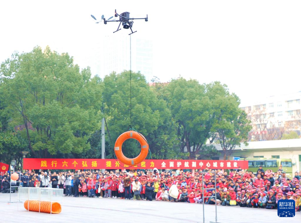 1月10日,在河南省南阳市公安局机关广场,市民观看无人机投放物品演练。