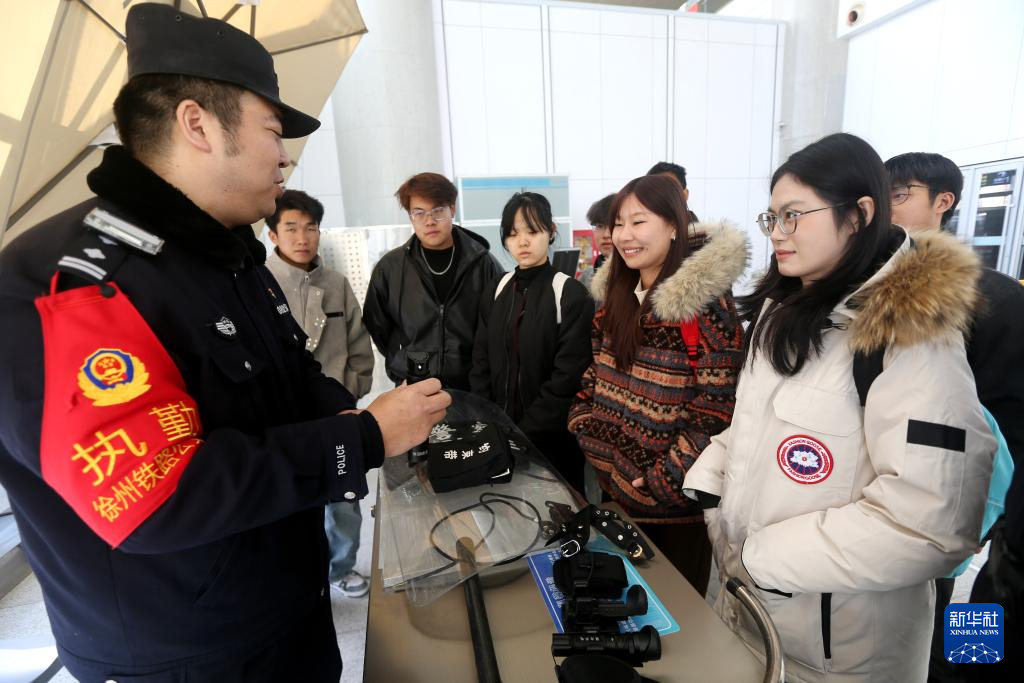 1月10日,在上海铁路公安局徐州铁路公安处连云港东站派出所举行的“相约110 与警同行”活动中,民警为旅客介绍警用装备。