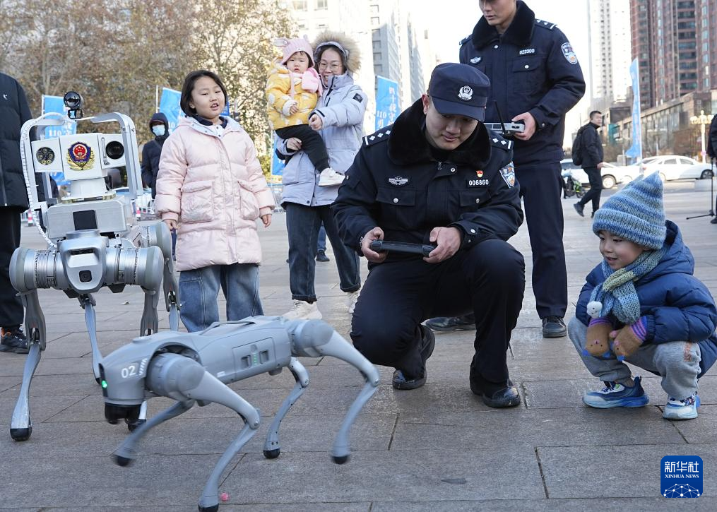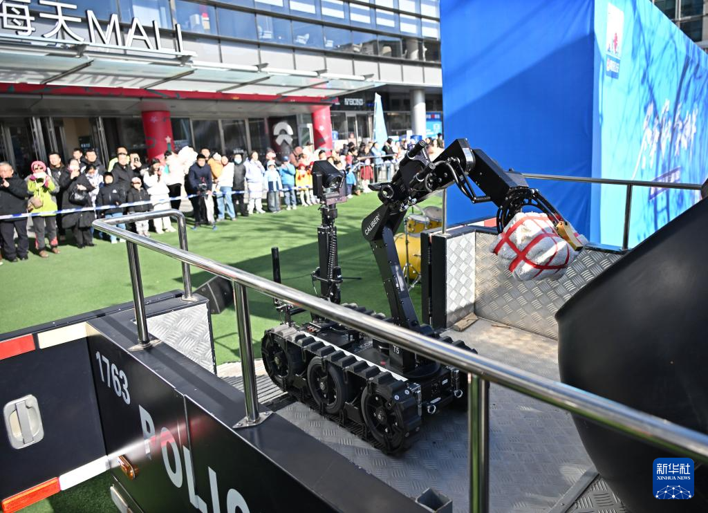 1月10日,在山东省青岛市举行的“冬季守护·平安相伴”第六个中国人民警察节主题宣防活动中,市民观看机器人排爆展示。