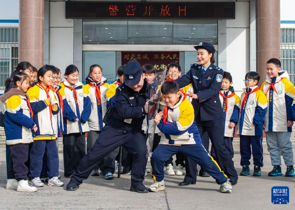 1月10日,在江苏淮安出入境边防检查站,民警给小朋友讲解警用装备使用知识。