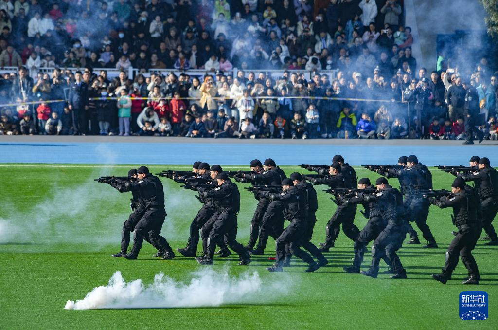 1月10日,浙江省金华市公安局在金华市警务训练基地举行警营开放活动,市民在观看防暴枪操演练。