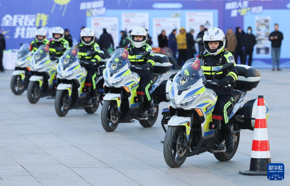 1月10日,在河北省石家庄市举办的“中国人民警察节”主题活动中,骑警进行摩托车技能展示。