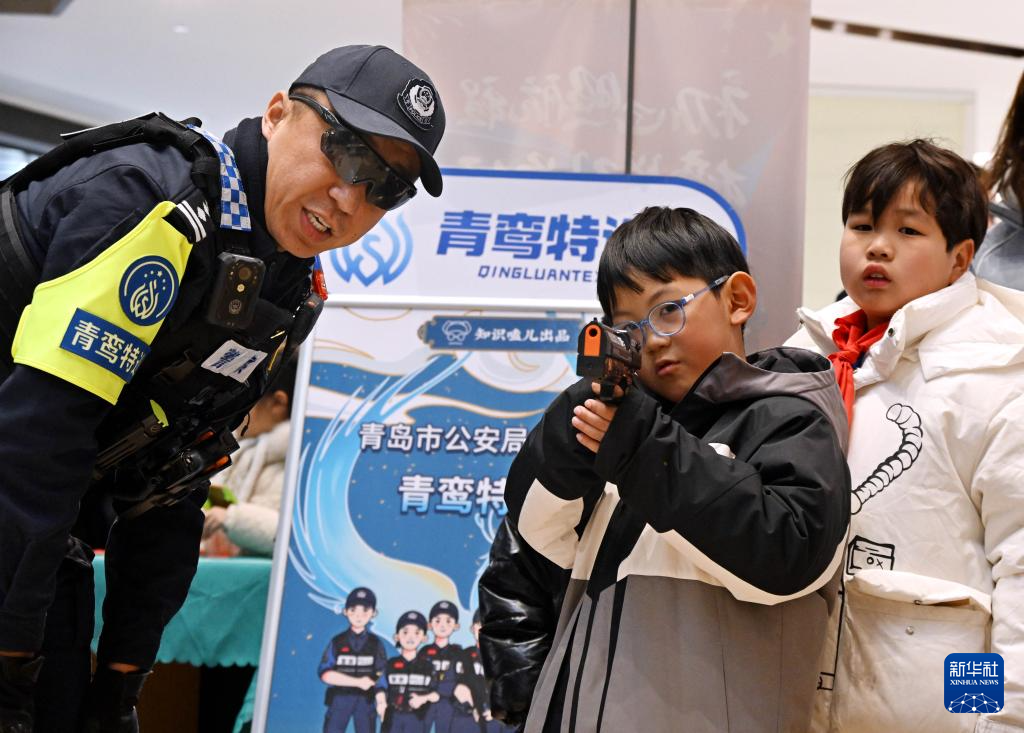 1月10日,在山东省青岛市举行的“冬季守护·平安相伴”第六个中国人民警察节主题宣防活动中,小朋友在参加模拟射击体验。