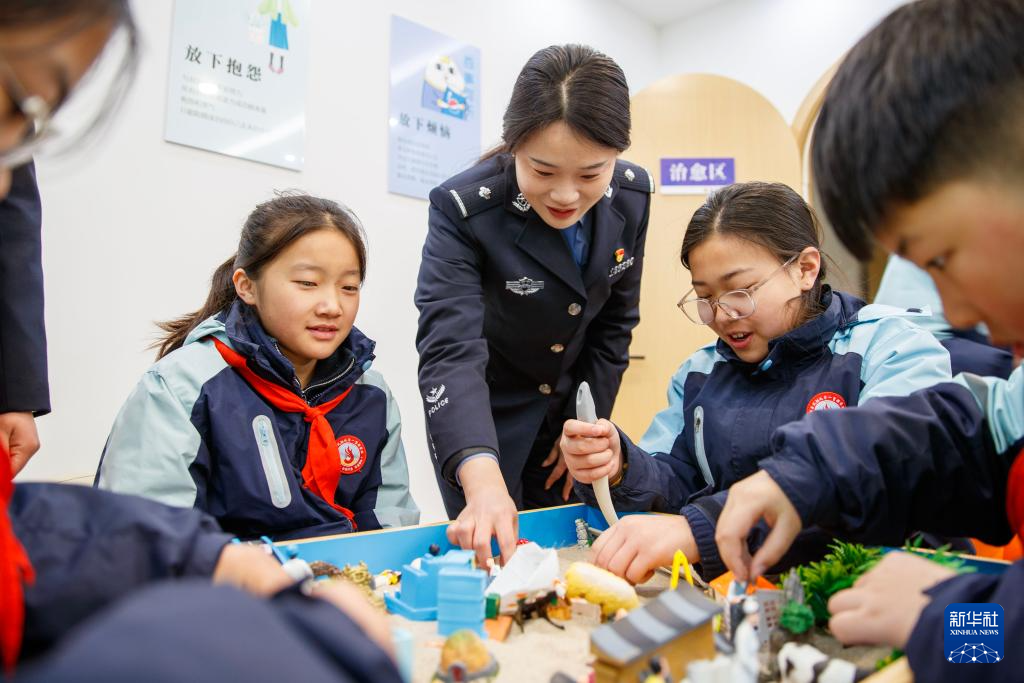 1月10日,河南省商丘市睢县公安局举行警营开放日活动,小朋友在睢县公安局心理健康服务站体验沙盘游戏。